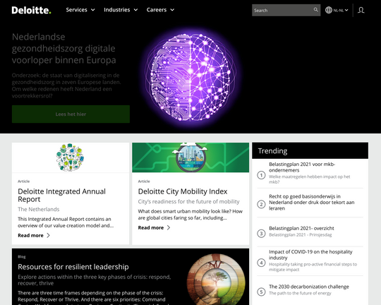 Deze diensten zijn verder afgestemd op sectorale behoeften, met specifieke expertise in onder andere de consumentensector, financiële diensten, overheids- en publieke diensten, technologie en gezondheidszorg. Deloitte’s diepgaande sectorale kennis stelt hen in staat om klantgerichte oplossingen te bieden die branche-specifiek zijn, maar ook geoptimaliseerd voor de lokale markt, zoals in Nederland.